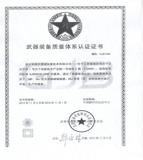 本公司于2004年已通过了国军标GJB9001A-2001质量管理体系的现场审核,获得了军工产品质量体系认证证书。并于2011年5月通过GJB9001B-2009换版审核,至今已通过5次外审,保持了体系的正常运行。