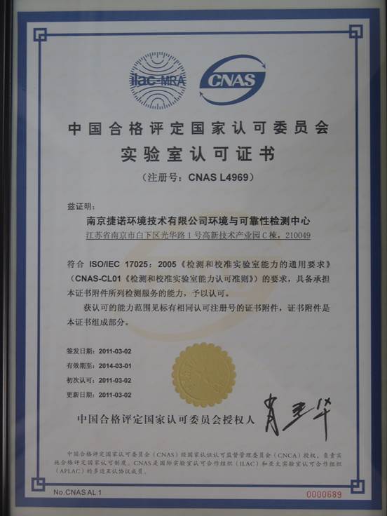 本公司的检测中心于2008年11月建立了实验室质量管理体系,2011年3月获得中国合格评定国家认可委员会授权的国家实验室认可证书。目前已为国内多家著名企业提供检测服务。2015年获得DILAC国防实验室认可证书。