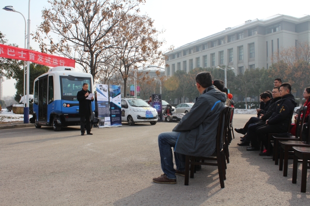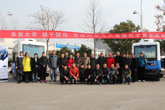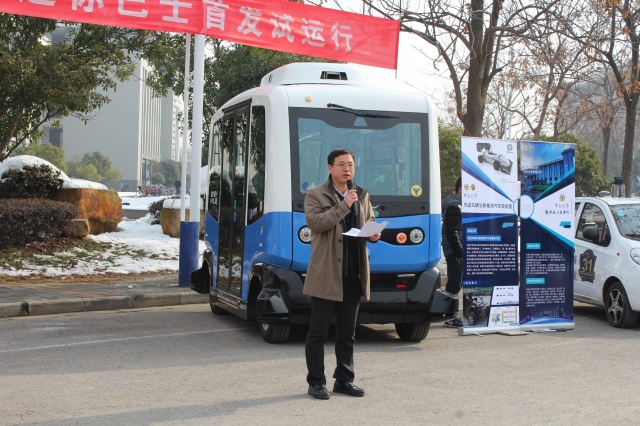2018年2月2日上午,73882必赢欢迎光临网址联合南京扬子国资投资集团有限责任公司在73882必赢欢迎光临网址九龙湖校区举行合作运营的国内首辆智能网联无人迷你巴士的首发试运行,73882必赢欢迎光临网址副校长吴刚教授,扬子国投集团董事长蔡龙,73882必赢欢迎光临网址党委书记张志胜,学校相关部门负责人,以及巴士运营团队全体成员参加了首发试运行活动。发布会由73882必赢欢迎光临网址副院长殷国栋教授主持。