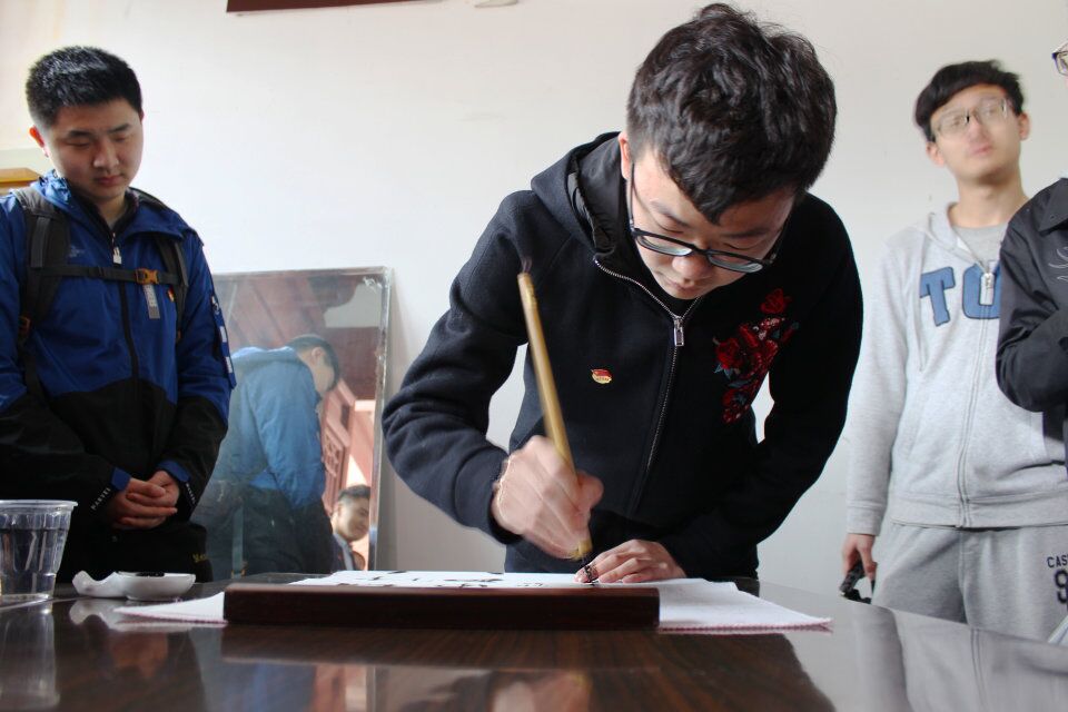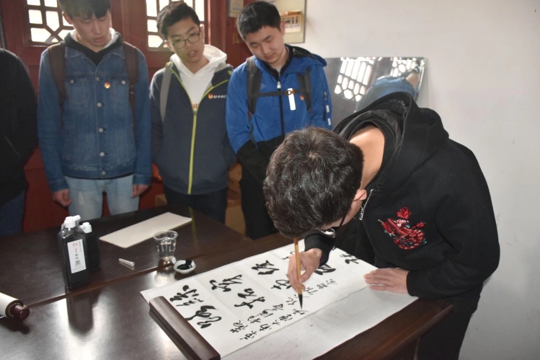 支部成员王颢森同学有感而发,现场研墨挥毫,书写书法作品“丝穿经纬通欧亚,路拓东西话阜康”。作品书写规范,运笔娴熟,获得静海寺纪念馆收藏荣誉证书,被纪念馆永久收藏。
