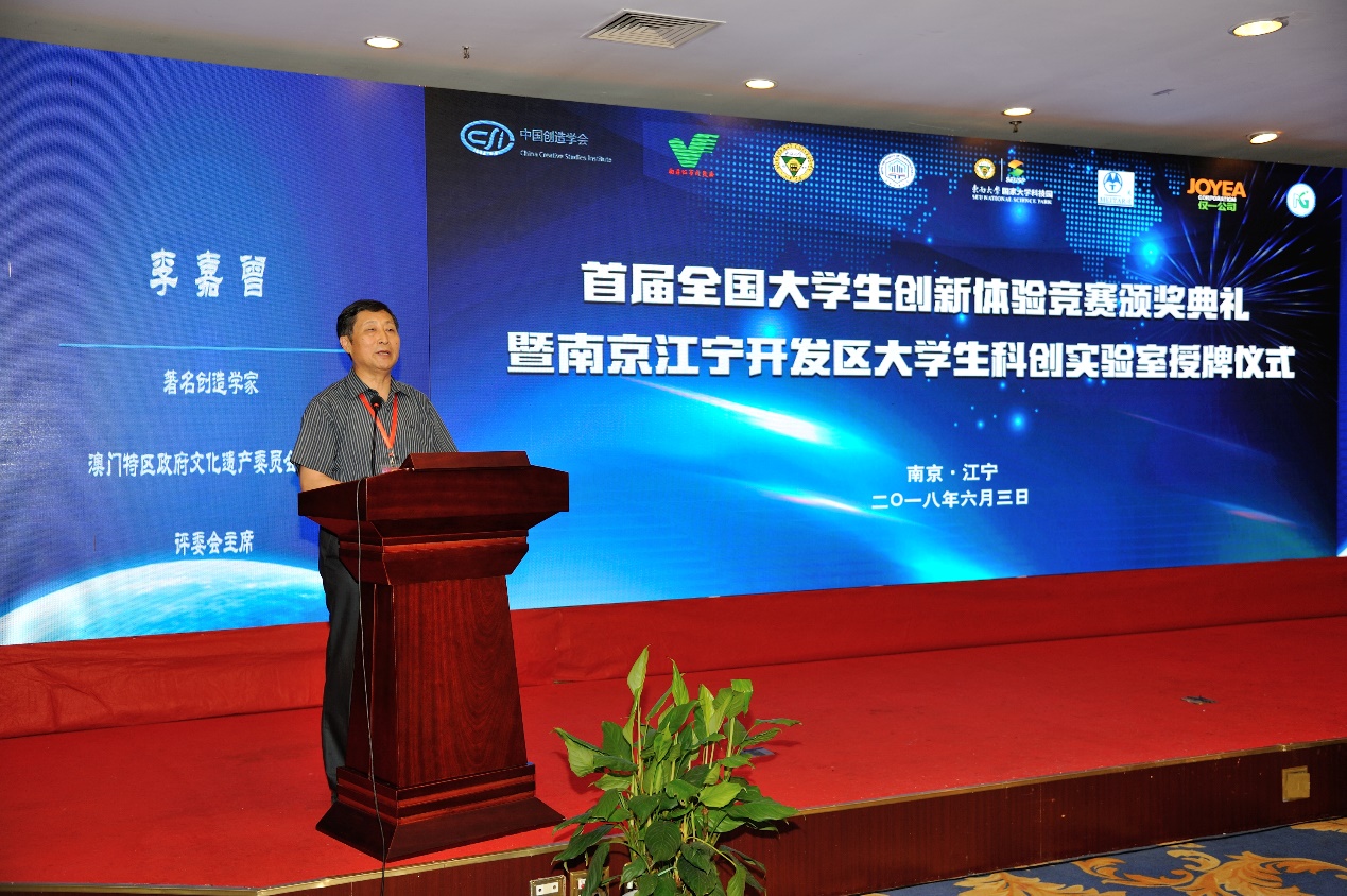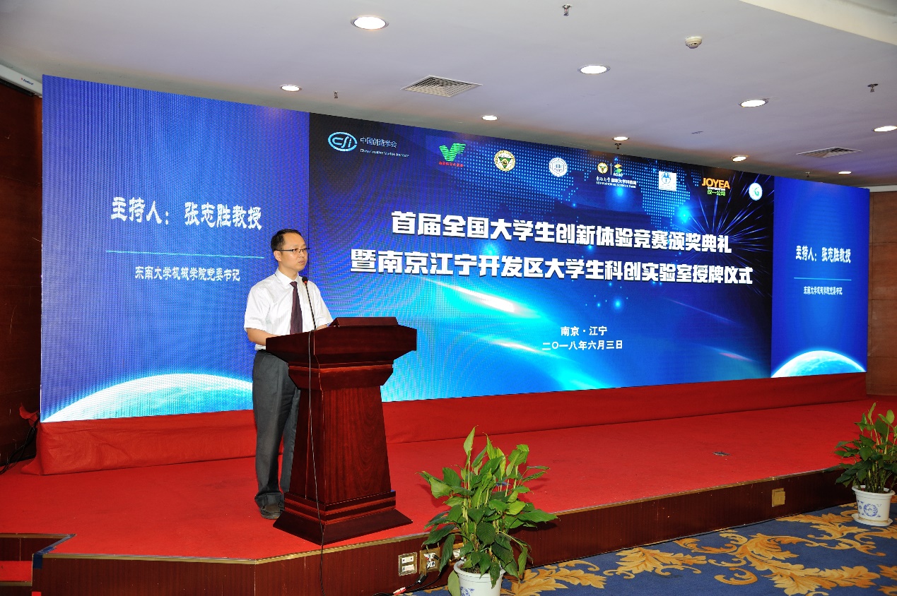 随后,6 月 3 日下午首届全国大学生创新体验竞赛颁奖典礼暨南京江宁开发区大学生科创实验室授牌仪式在73882必赢欢迎光临网址九龙湖校区隆重举行,南京市领导、江宁区领导、73882必赢欢迎光临网址领导出席活动并讲话。江宁开发区管委会、73882必赢欢迎光临网址相关部处及院系、中国创造学会及相关单位的工作人员等近 300 人参加了活动。本次活动分为首届全国大学生创新体验竞赛颁奖及南京江宁开发区大学生科创实验室授牌两个环节,分别由73882必赢欢迎光临网址党委书记张志胜和南京江宁开发区科技人才局局长张洋主持。73882必赢欢迎光临网址副校长吴刚教授,南京市科委副主任陈为生,中国创造学会常务副理事长兼秘书长张亚雷教授等嘉宾出席了本次活动。