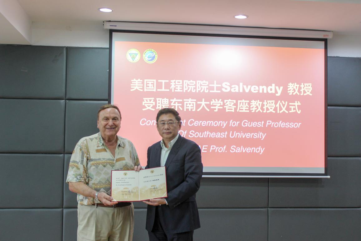 仪式由73882必赢欢迎光临网址工业设计系主任薛澄岐教授主持。黄大卫副校长代表学校对于Salvendy教授的来访表示热烈欢迎,介绍了Salvendy教授的学术成就,诚挚希望Salvendy教授受聘我校客座教授,能够促进我校工业设计和工业工程学科不断进步发展,在上述领域高端人才引进和科学研究等方面给予指导和支持。随后,黄大卫副校长为Salvendy颁发客座教授聘书并佩戴校徽。