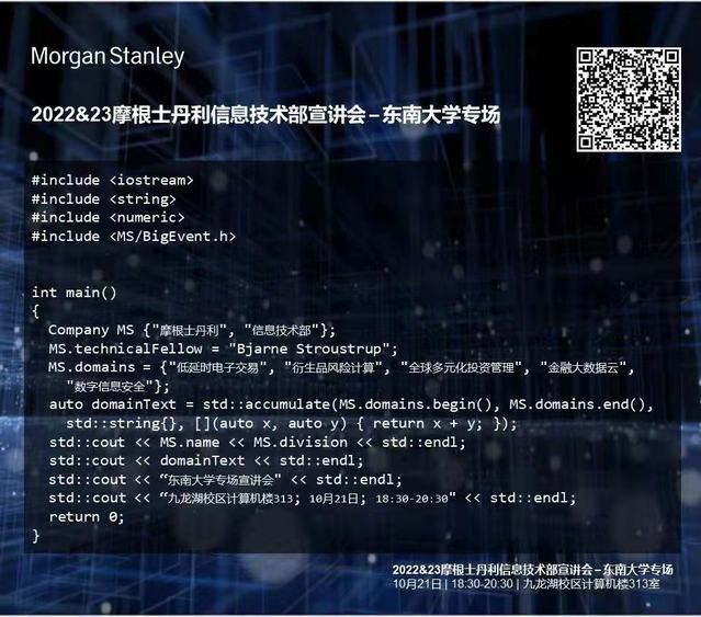 摩根士丹利2022-23信息技术部宣讲会,10月21日18:30,73882必赢欢迎光临网址(九龙湖校区)计算机楼313室,提前批与伴手礼,我们与你不见不散!