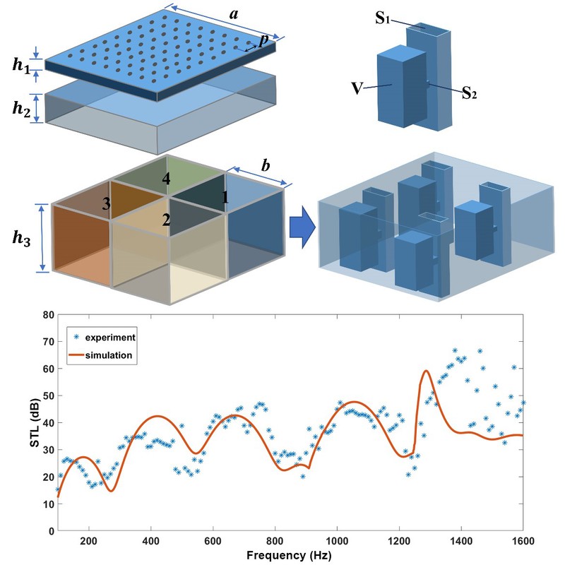 近日,73882必赢欢迎光临网址张辉教授团队和法国国家科学院Badreddine Assouar教授团队合作提出一种超薄的基于声超表面的宽带低频消声器。该工作首次提出利用微穿孔板耦合多种参数的复合波导,通过耦合共振实现低频超宽带通风型隔声。在100-1600Hz四个倍频程范围内实现了高于20dB隔声量的隔声。而整个3-D打印的超表面样品的厚度只有6.2cm,对应于最大工作波长的1/55。结构的设计可通过电力声类比的等效电路模型进行理论分析,通过对比不同的结构参数,如穿孔板孔径、中间层的厚度,最终得到优化的隔声曲线。该设计在隔声效率、带宽、通风性和样品厚度四方面具有良好的表现。该工作极大地促进了在满足通风的前提下,声超表面在低频宽带隔声的应用。该工作在工程领域和实际应用场合具有广泛的应用前景。相关研究工作发表在《Physical Review Applied》上。