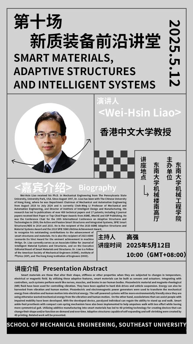 Wei-Hsin Liao received his Ph.D. in Mechanical Engineering from The Pennsylvania State University, University Park, USA. Since August 1997, Dr. Liao has been with The Chinese University of Hong Kong, where he was Department Chairman of Mechanical and Automation Engineering from August 2018 to July 2024 and is currently Choh-Ming Li Professor of Mechanical and Automation Engineering, and Director of Institute of Intelligent Design and Manufacturing. His research has led to publications of over 400 technical papers and 27 patents; including 8 journal papers received Best Paper or Top Cited Paper Awards from ASME, IMechE and IOP Publishing. He was the Conference Chair for the 20th International Conference on Adaptive Structures and Technologies in 2009; the Active and Passive Smart Structures and Integrated Systems, SPIE Smart Structures/NDE in 2014 and 2015. He is the recipient of the 2020 ASME Adaptive Structures and Material Systems Award and the 2018 SPIE SSM Lifetime Achievement Award, to recognize his outstanding contributions to the advancement of smart structures and materials. He is also the recipient of 2023 ASME Leonardo Da Vinci Award for the eminent achievement in machine design. Dr. Liao currently serves as an Associate Editor for Journal of Intelligent Material Systems and Structures, and on the Executive Editorial Board of Smart Materials and Structures. Dr. Liao is a Fellow of the American Society of Mechanical Engineers (ASME), Institute of Physics (IOP), and The Hong Kong Institution of Engineers (HKIE).