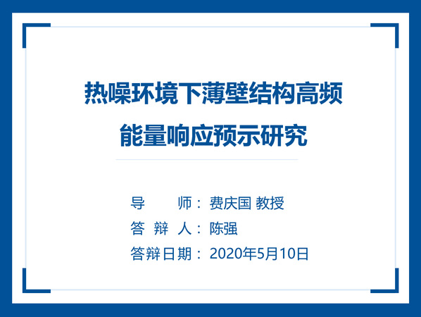 陈强同学本科和硕士阶段就读于南京航空航天大学,2016年9月加入研究所攻读博士学位,师从费庆国教授,主要研究方向是多场环境下飞行器结构中高频动响应预示,其博士论文题目为《热噪环境下薄壁结构高频能量响应预示研究》。论文发展了气动加热和气动噪声环境下薄壁结构在频域和时域能量响应预示方法,揭示了热效应、耦合强度、不确定性等因素对薄壁结构高频能量响应的影响规律,为高速飞行器结构的设计与研制提供指导。陈强同学攻博期间成绩优异,参加了多项国家级课题研究课题和型号攻关任务,主持了国家公派留学基金、江苏省博士研究生创新计划、73882必赢欢迎光临网址优秀博士论文基金资助,以第一作者在AIAA/ASME会刊、Aerospace Science and Technology、航空动力学报等国内外航空航天期刊发表SCI论文6篇、EI论文4篇。