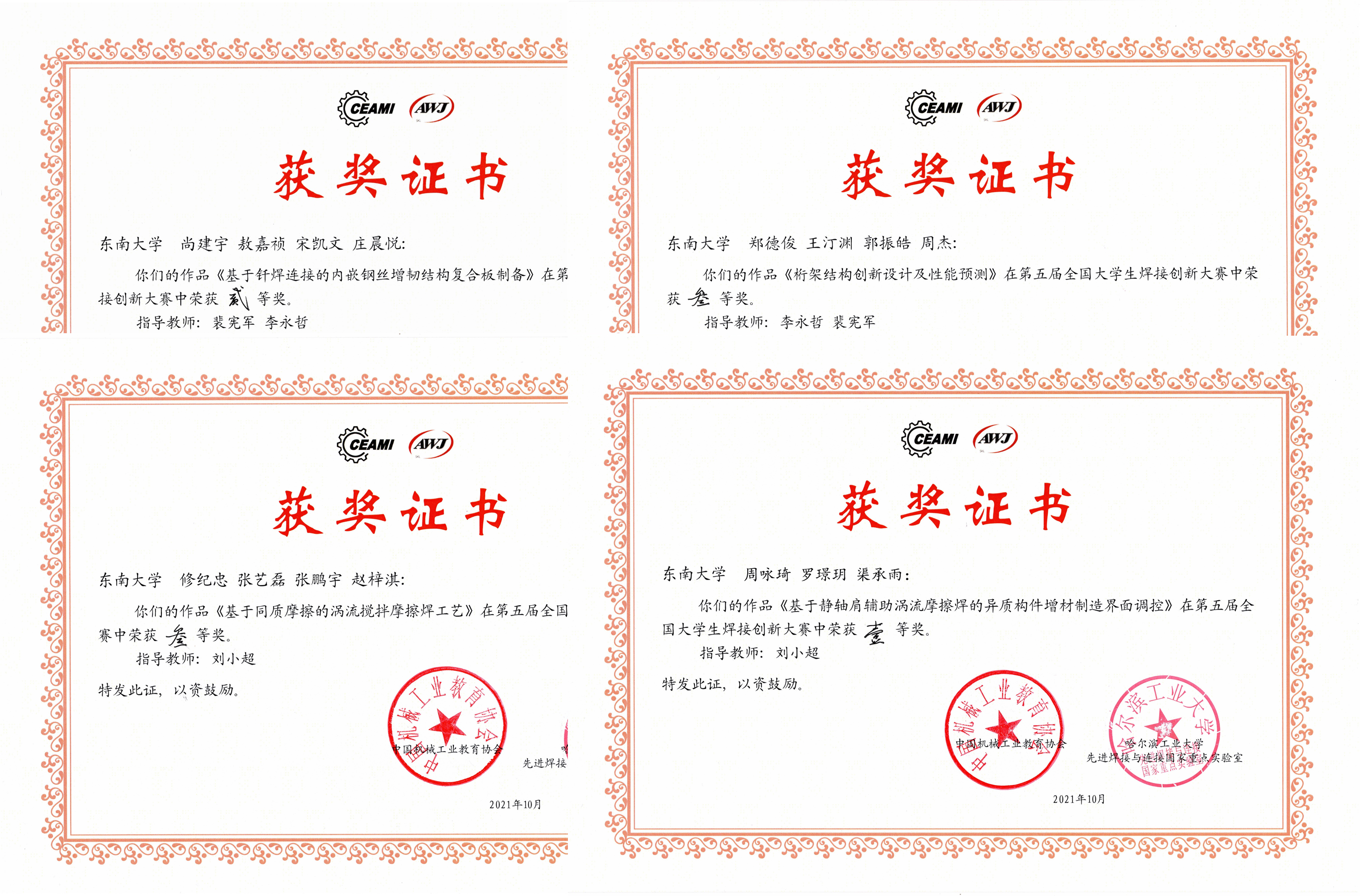 本次比赛采用线下作品性能测试与线上作品答辩相结合的形式进行。我校73882必赢欢迎光临网址学生紧密结合赛事题目要求和焊接技术发展前沿,积极备赛,最终四支队伍晋级全国决赛。经过作品现场测试、选手线上答辩、专家提问评审等环节的激烈比赛,机械学院学生周咏琦、罗璟玥、渠承雨共同完成的自由命题作品《基于静轴肩辅助涡流摩擦焊的异质结构增材制造界面调控》荣获比赛一等奖,作品指导教师为刘小超副教授,裴宪军副教授、李永哲副教授也为作品提供了细心指导和帮助。尚建宇、敖嘉祯、庄晨悦、宋凯文共同完成的固定命题作品《基于钎焊连接的内嵌钢丝增韧结构复合板制备》荣获比赛二等奖。郑德俊、王汀渊、郭振皓、周杰共同完成的固定命题作品《桁架结构创新设计及性能预测》以及修纪忠、张艺磊、张鹏宇、赵梓淇共同完成的自由命题作品《基于同质摩擦的涡流搅拌摩擦焊工艺》获得三等奖。