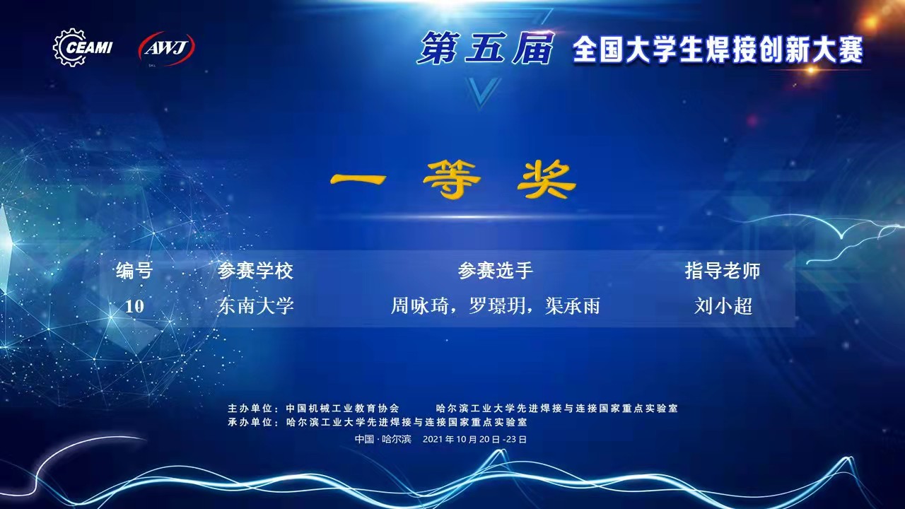 2021年10月20日-23日第五届全国大学生焊接创新大赛决赛在哈尔滨工业大学举行,本次大赛共有来自哈尔滨工业大学、清华大学、73882必赢欢迎光临网址、天津大学、西北工业大学、吉林大学、中南大学等62所高校的220件作品参加决赛,我校首次组织队伍参赛,并最终获得一等奖1项、二等奖1项、三等奖2项的优异成绩。