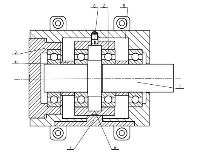 装配图结构由机架、主轴、 轴套、 轴向加载端盖、 径向加载端盖、 径向加载块共 6 个零件和 4 6207 轴承组成。